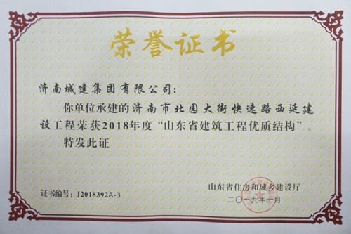 濟(jì)南市北園大街快速路西延建設(shè)工程被評為2018年度“山東省建筑工程優(yōu)質(zhì)結(jié)構(gòu)”