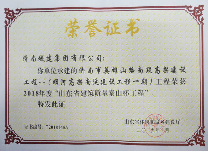 濟南市英雄山路南段高架建設(shè)工程(順河高架南延建設(shè)工程一期)工程被評為2018年度“山東省建筑質(zhì)量泰山杯工程”