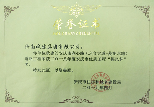 安慶市湖心路(迎賓大道-菱湖北路)道路工程被評為2018年度安慶市優(yōu)質(zhì)工程“振風杯”獎