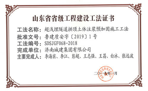 集團(tuán)“超淺埋隧道拱頂土體注漿預(yù)加固施工工法”被評(píng)為山東省省級(jí)工程建設(shè)工法