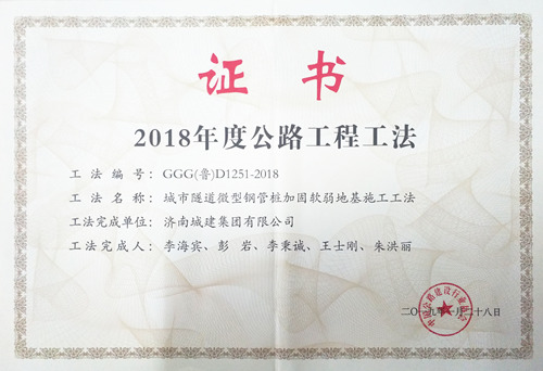 集團(tuán)“城市隧道微型鋼管樁加固軟弱地基施工工法”被評(píng)為2018年度公路工程工法