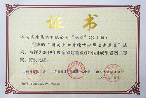 集團(tuán)”旭日“QC小組完成的《研制土方開(kāi)挖噴漆降塵新裝置》成果被評(píng)為“2019年度全省建筑業(yè)QC小組成果競(jìng)賽二等獎(jiǎng)