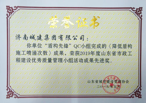 集團“盾構(gòu)先鋒”QC小組完成的《降低盾構(gòu)施工噴涌次數(shù)》成果榮獲“2019年度山東省市政工程建設優(yōu)秀質(zhì)量管理小組活動成果先進獎
