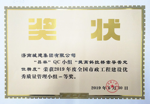 集團“昌林”QC小組《提高斜拉橋索導管定位精度》榮獲“2019年度全國市政工程建設(shè)優(yōu)秀質(zhì)量管理小組一等獎”