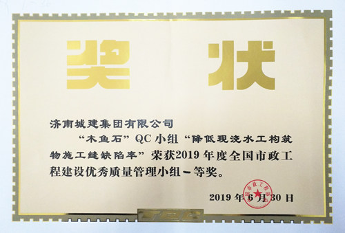 集團(tuán)“木魚(yú)石”QC小組《降低現(xiàn)澆水工構(gòu)筑物施工縫缺陷率》榮獲“2019年度全國(guó)市政工程建設(shè)優(yōu)秀質(zhì)量管理小組一等獎(jiǎng)”