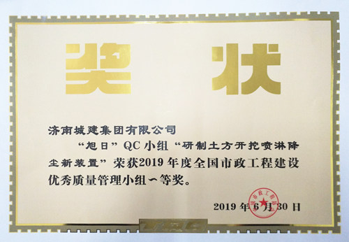 集團(tuán)“旭日”QC小組《研制土方開挖噴淋降塵新裝置》榮獲“2019年度全國(guó)市政工程建設(shè)優(yōu)秀質(zhì)量管理小組一等獎(jiǎng)”