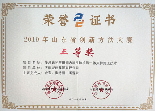 集團《淺埋暗挖道洞內(nèi)端頭墻樁錨一體支護施工技術(shù)》榮獲“2019年度山東省創(chuàng)新方法大賽三等獎”